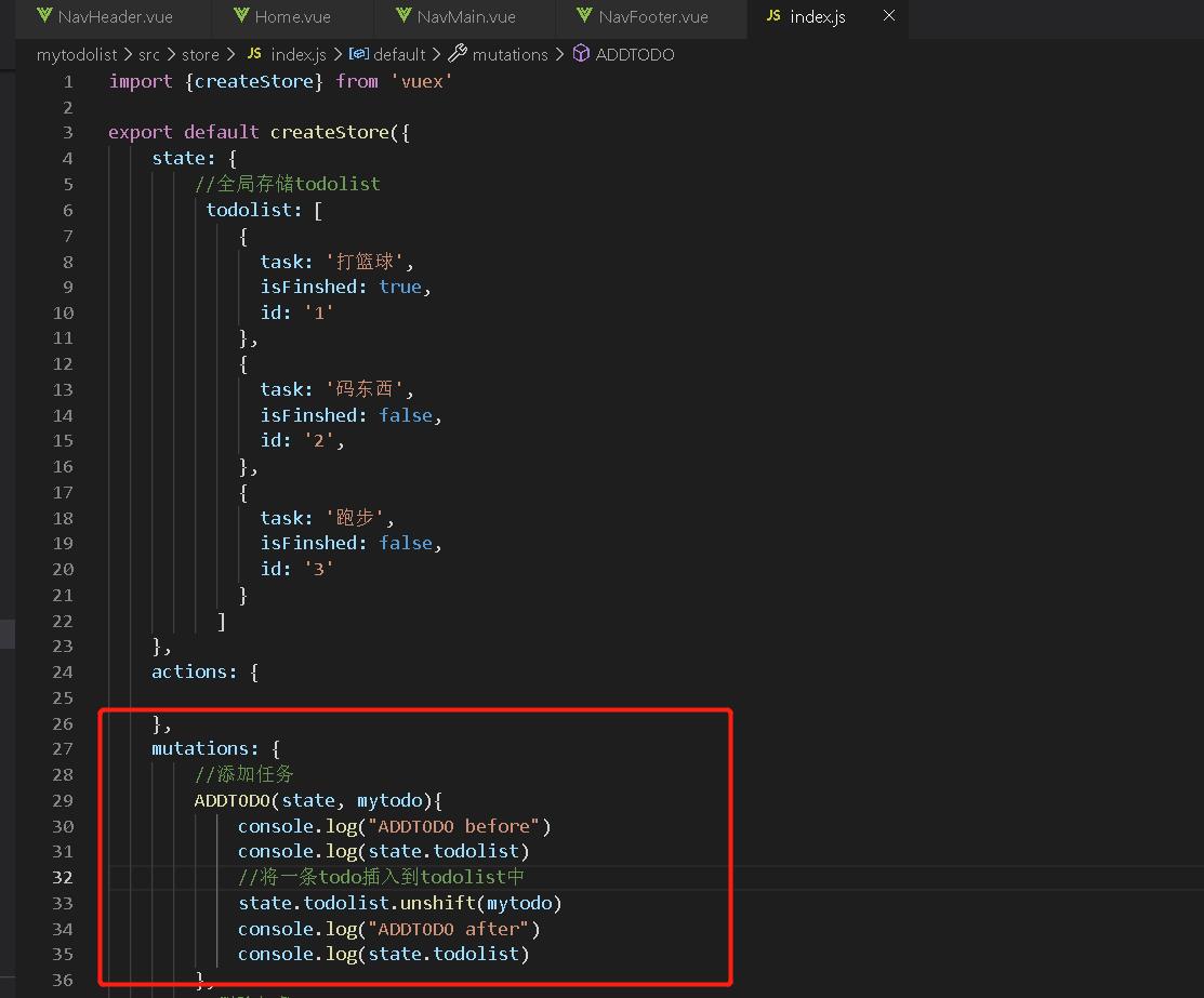 以此来执行mutation里的ADDTODO方法,将新的待办事项插入到todolist中
