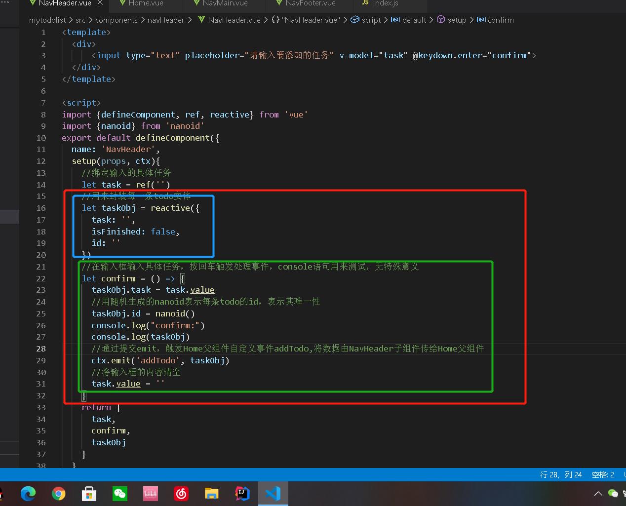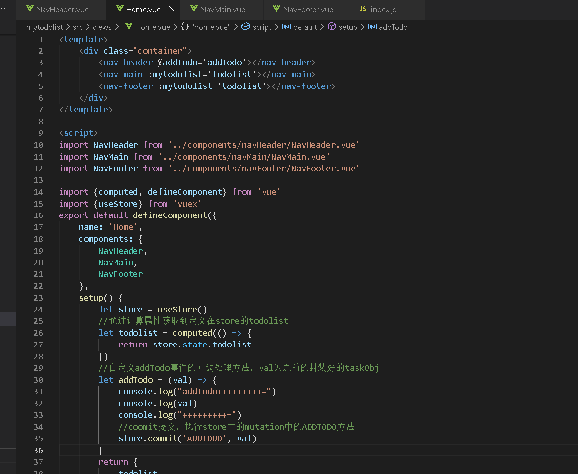 上面的代码的逻辑很简单,在输入框输入待办的任务task,由于双向绑定,将获得的task封装成一个taskObj对象(一条待办事项),然后通过触发自定义事件addTodo将这个taskObj对象传给父组件