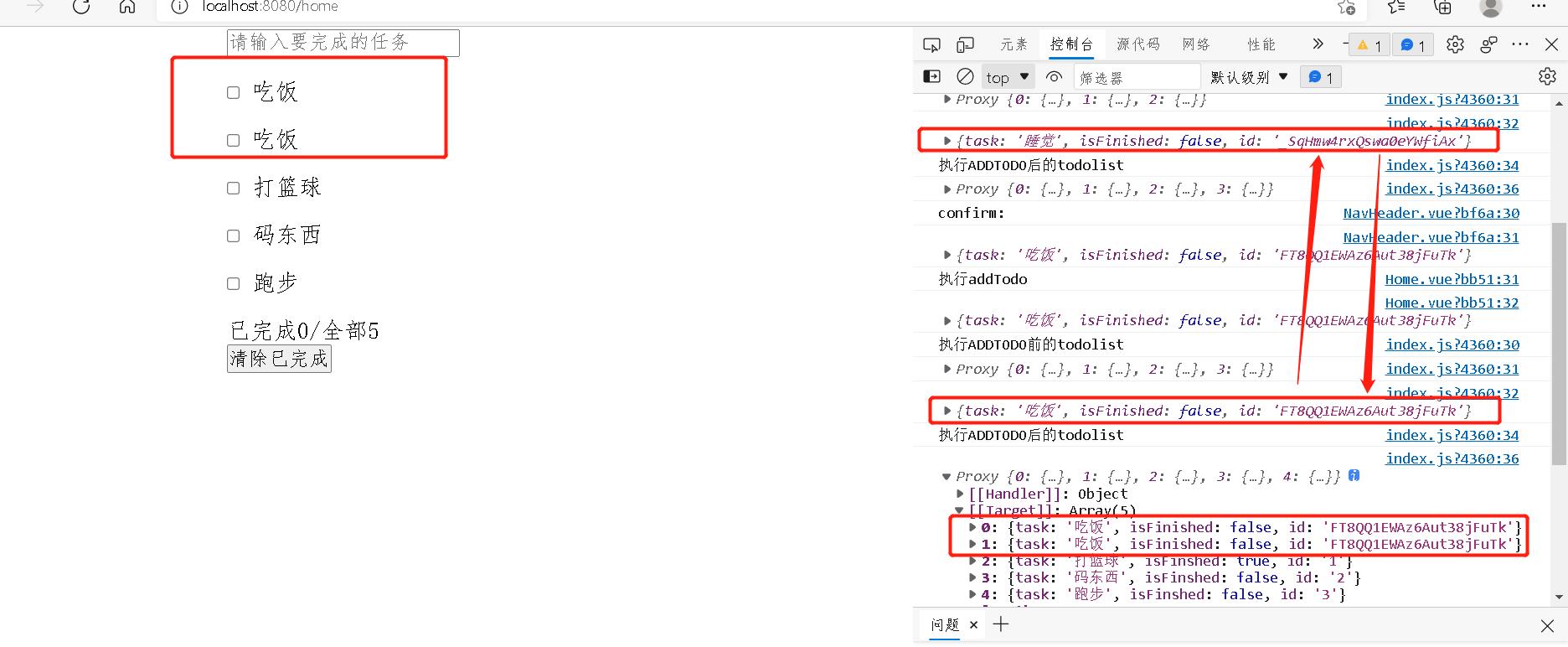 明明插入俩个不一样的待办事项并且他们的id是通过nanoid随机生成的,新的数据会覆盖掉之前插入的数据…对没错,女士们先生们就这个错误折磨我快两天(再次点题),我这两天心情极度低落,这只是一个简单的小demo却给我写成了这样。我一度怀疑我是不是白学了,我是不是应该注意进厂时机(说真的,我没有开玩笑)傅杰豪,你连这样一个错误都找不出来,你学伱抹的js、vue我把代码从头到尾看了不下十遍,一遍又一遍地调试,也是一点效果也没有…在床上无数次躺下,又坐起。当时我真的很想跳过这个demo,但是这个demo太重要了,它虽然小却“五脏俱全”,它涉及了vue的许多使用技巧,比如路由router、vuex、父子组件之间的数据传递等等。如果我跳过了,我后面怎么办?不是项目的demo就开始逃避不去攻克…光凭视频看的和那点自欺欺人的笔记就认为自己已经学了很多了?